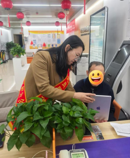 当天,注意到这位年长且行动不便的客户后,身为党员先锋岗的消保部负责人立即主动迎上,与身着橙色志愿者服装的“小橙大爱”志愿者默契配合,开启了一场无缝衔接的暖心接待。