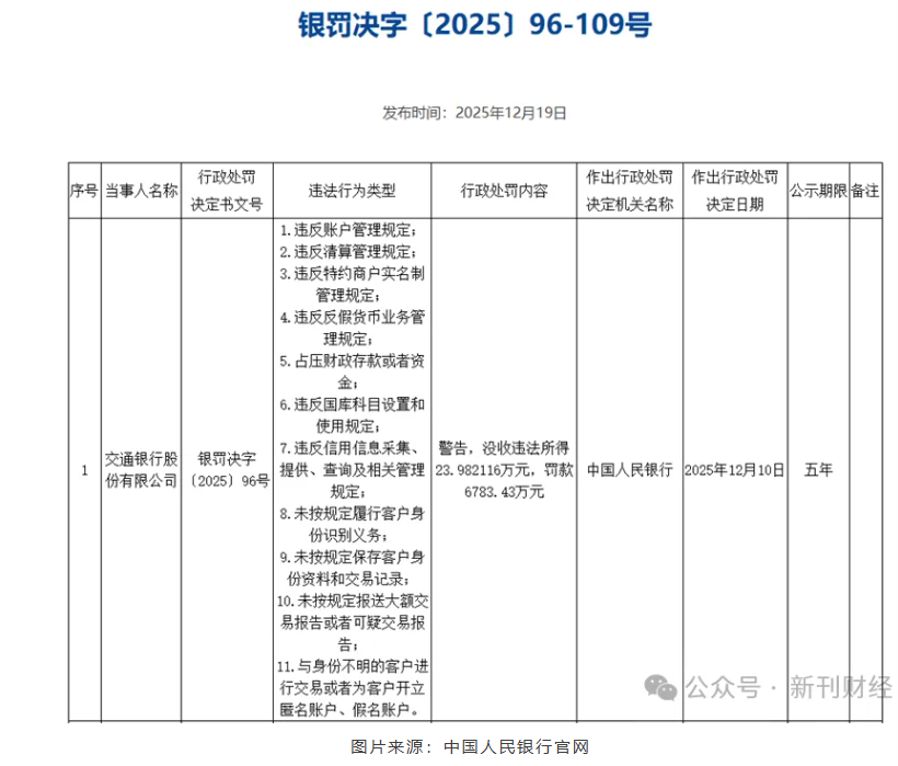 中国人民银行官网显示,12月19日,交通银行因11项违法违规行为,被中国人民银行开出了总额6807.41万元的罚单——没收违法所得23.982116万元,并处罚款6783.43万元。同时,13名总行核心部门责任人被追责,罚款金额从0.4万元至17万元不等。这一“天价罚单”并非“天降罚单”,深入探究其中原委,就会发现交行基础合规管理的问题。