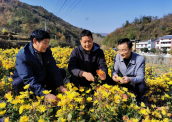 图:中国人寿派驻驻村干部查看帮扶产业金丝皇菊种植情况