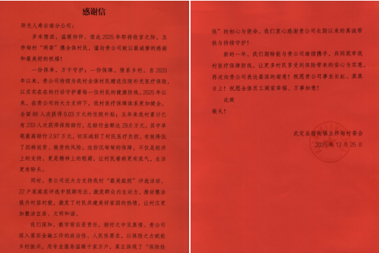信中写道,自2020年以来,阳光人寿云南分公司持续为五拃甸村全体村民赠送住院补充医疗保险,以实实在在的行动守护每一位村民的健康防线。数据印证着这份守护的分量:2025年,该村86人次通过该保险获得住院补贴9.03万元;五年累计赔付233人次,总赔付金额达29.6万元,单笔最高赔付2.97万元。这份“沉甸甸的保障”不仅减轻了村民医疗负担,更有效降低了因病返贫、致贫风险,让村民看病更有底气、生活更有盼头。