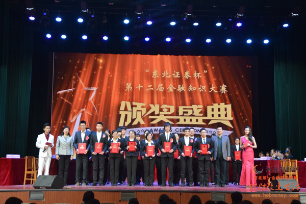 河北理财网讯(记者 聂晓红)12月5日,由河北经贸大学主办的“东北证券杯”“金钊试峰,融汇精英”第十二届金融知识大赛在学校礼堂召开。来自河北工业大学、河北师范大学、河北科技大学、河北金融学院、石家庄铁道大学、河北地质大学以及河北经贸大学的七支参赛队伍经过激烈的角逐,最终,来自河北经贸大学和河北师范大学的两支队伍荣获一等奖。