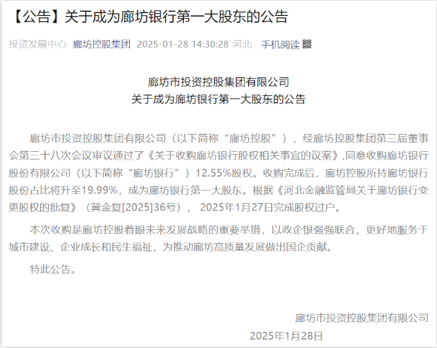 据了解,“经廊坊控股集团第三届董事会第三十八次会议审议通过了《关于收购廊坊银行股权相关事宜的议案》,同意收购廊坊银行12.55%股权。收购完成后,廊坊控股所持廊坊银行股份占比将升至19.99%,成为廊坊银行第一大股东。根据《河北金融监管局关于廊坊银行变更股权的批复》(冀金复[2025]36号),2025年1月27日完成股权过户。”
