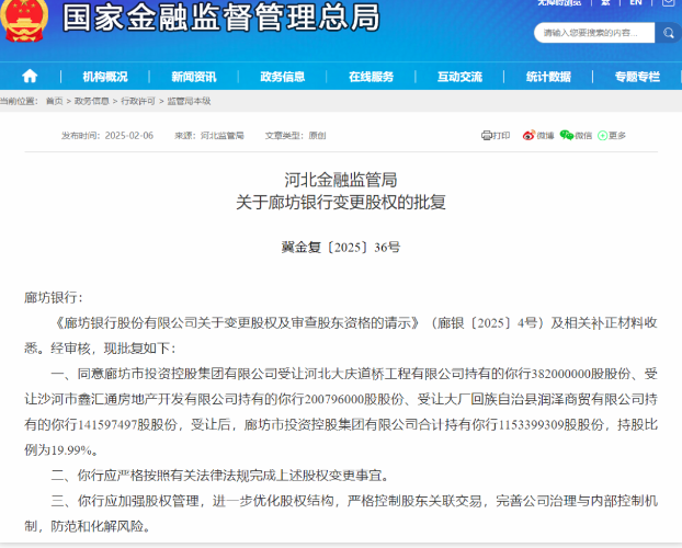 2月6日,国家金融监管总局官网披露,同意廊坊控股受让河北大庆道桥工程有限公司、沙河市鑫汇通房地产开发有限公司、大厂回族自治县润泽商贸有限公司持有的廊坊银行相关股份。受让后,廊坊控股合计持有廊坊银行11.53亿股股份,持股比例为19.99%。
