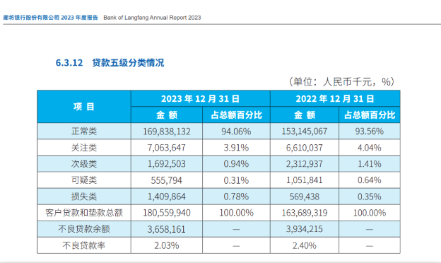 2023年,得益于廊坊银行“继续加大不良资产的处置力度,加强了对存量逾期客户的处置管理”,不良贷款余额有所下降,从上年末的39.34亿元降至36.58亿元;不良贷款率也从上年末的2.40%降至2.03%,下降0.37个百分点。截至2023年,末廊坊银行的关注类、次级类、可疑类贷款占比有不同程度下降,损失类贷款占比上升。
