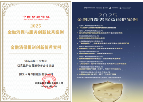 河北理财网综合(丹青)近日,阳光人寿凭借《阳光人寿:创新消保工作方法,切实维护金融消费者合法权益》案例,成功入选中国金融传媒“金融消保机制创新优秀案例”名单,并荣获21世纪经济报道金融研究院与上海金融与发展实验室联合发起的“2025金融消费者权益保护课题”优秀案例。两项荣誉的取得,充分彰显了阳光人寿在金融消费者权益保护领域的卓越成就与创新实践。
