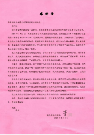 河北理财网综合(刘杰)2026年1月初,阳光人寿湖北分公司客户服务经理刘志刚收到了一封来自客户辜先生的感谢信。信中,客户用真挚的语言表达了对公司及刘志刚的感谢与认可。而这份温暖回馈的背后,藏着一段跨越十六年的保单守护故事——一份险些被遗忘的保障,因工作人员的责任与坚守重焕光彩。